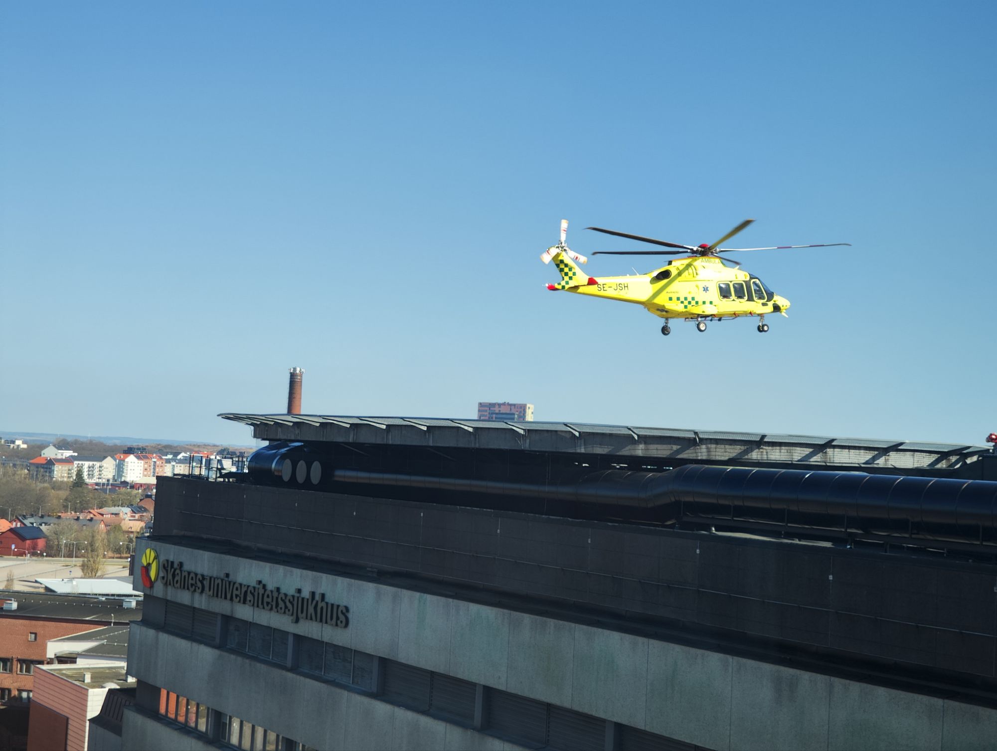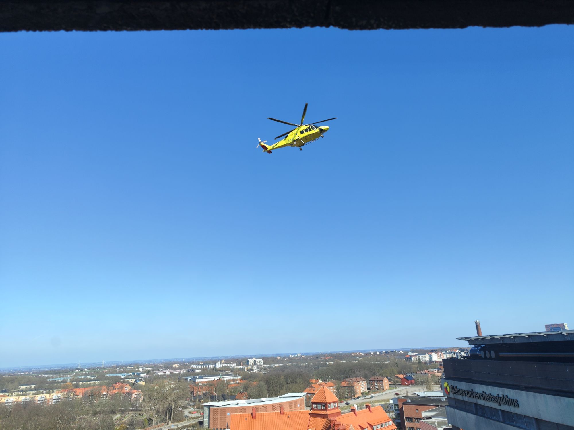 Inte fullt så förekommande om klockan idag….Men i god tid och hyffsat pigg. Betydligt lättare när solen visar sin närvaro strax innan 06. En mäktig känsla att stå på tolvte våningen och se Lund vakna upp. Passade på att ta foto när ambulans helikoptern kom till sjukhusets helikopterplatta.